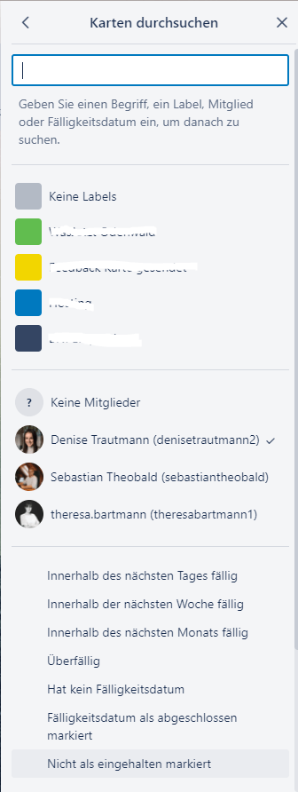 Schnell können Listen mit unzähligen Karten befüllt sein und der Überblick geht verloren, da nicht alle Karten direkt auf der Startseite angezeigt werden. Daher ist es für den alltäglichen Umgang mit Trello wichtig, die richtigen Labels zu setzen und die Karten immer den relevanten Personen zuzuweisen. Später kannst dann Du Dir über die „Karten durchsuchen„-Funktion nur die für Dich relevanten Karten auf dem Board anzeigen lassen. Somit ist es überhaupt nicht schlimm, wenn ein Board sehr viele Karten enthält, solange diese klaren Zuständigkeitsbereichen und Verantwortlichkeiten zugewiesen sind.