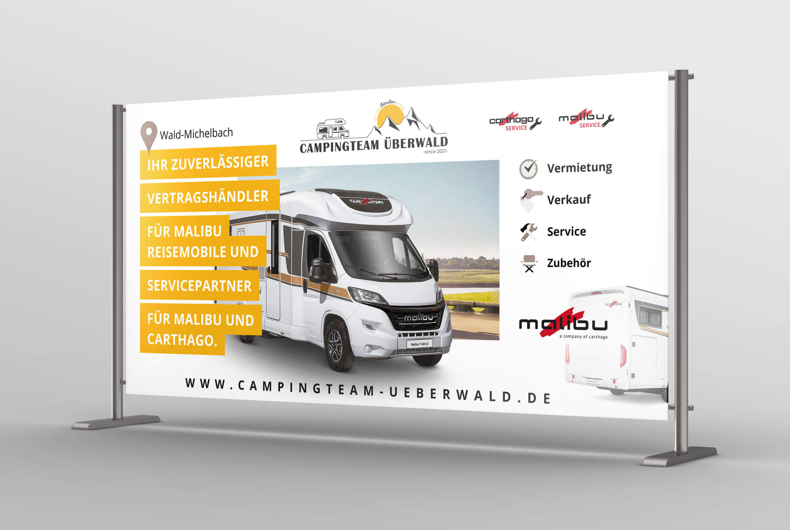 Ein großer Banner mit den Maßen 3,40 m x 1,73 m bringt andere Anforderungen mit sich, wie ein Flyer im DIN A5 Format. Die Lesbarkeit muss auch aus der Ferne gegeben sein und durch entsprechende Visualisierungen der Kernaspekt innerhalb weniger Sekunden erkennbar sein. So hat sich die Anordnung der einzelnen Elemente verschoben, wir haben eine entsprechende Schriftgröße ausgewählt und deutlich erkennbar die URL zu Webseite platziert. Nun hängt der Banner gut sichtbar am Standort des Campingteam Überwald an der Hauptstraße in Wald-Michelbach.