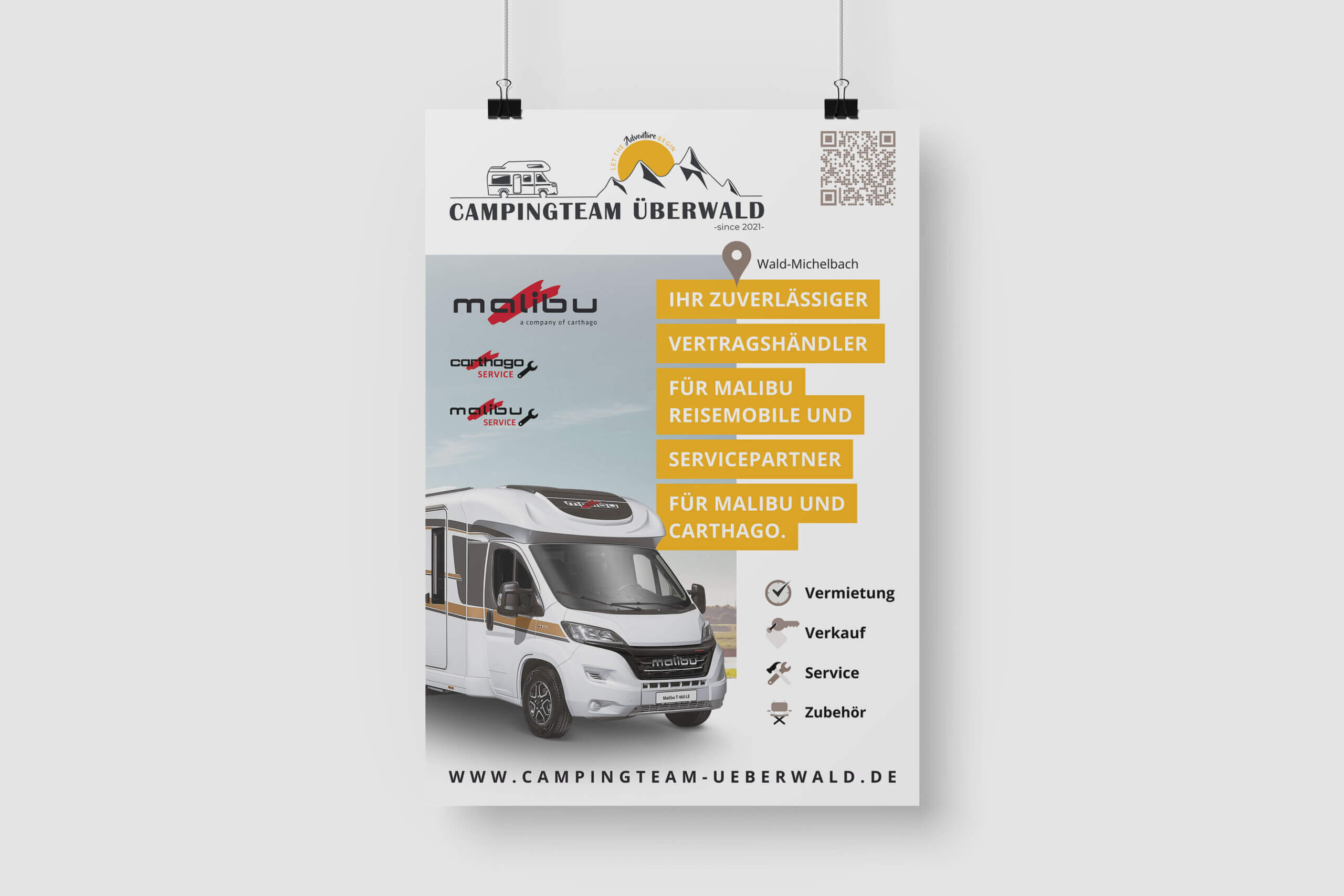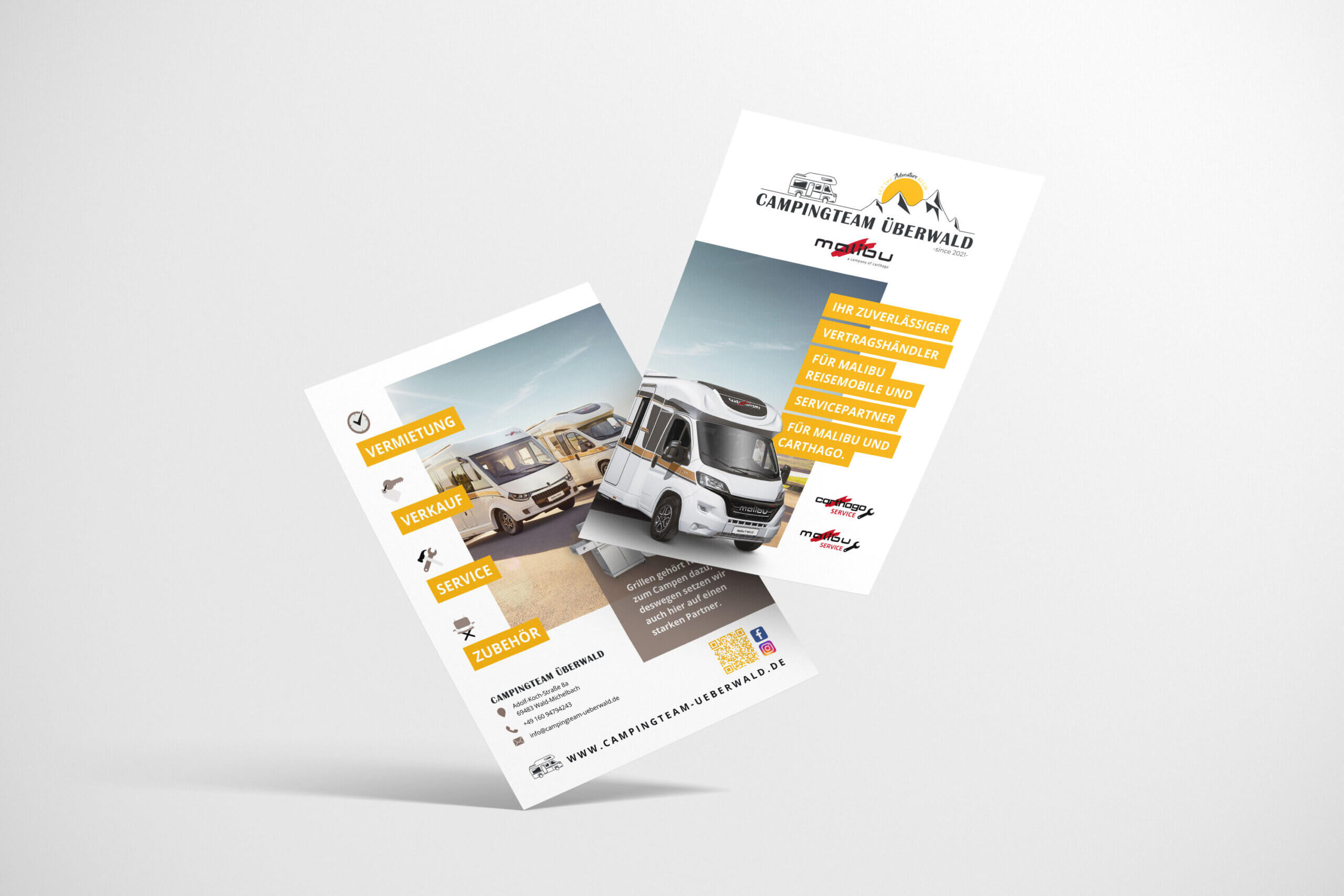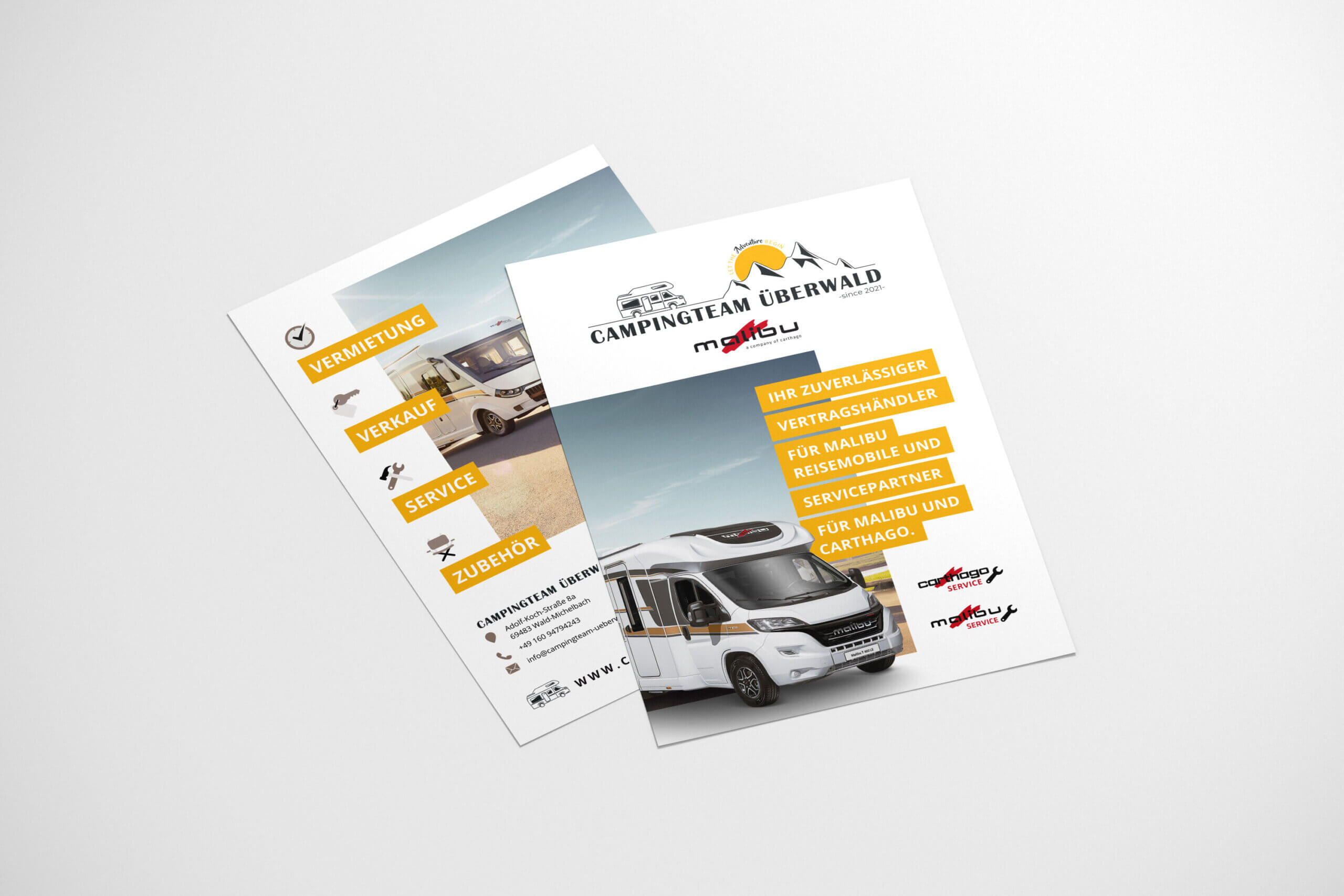 Beim Campingteam Überwald hatten wir die Besonderheit, dass ausgehend vom Logo und orientiert am Design der Webseite ein Banner, ein Flyer, eine Anzeige und Plakate erstellt werden sollten. Für einen Möglichst hohen Wiedererkennungswert des Wald-Michelbacher Unternehmens war die Herausforderung, ein individuelles Design für jedes Format zu finden und gleichzeitig einen konsistenten Auftritt zu schaffen. Hierfür entwickelten wir ein erstes Design im Hochkant Format für einen zweiseitigen Flyer mit allen wichtigen Informationen zu den Leistungen und Alleinstellungsmerkmalen des Campingteam Überwald.