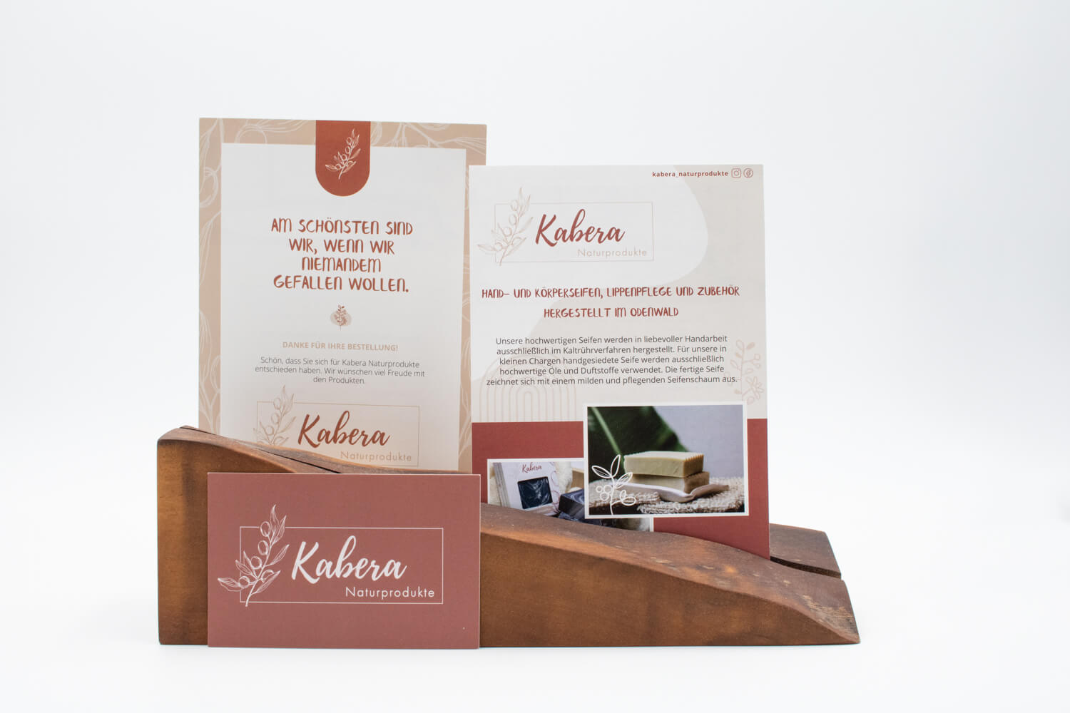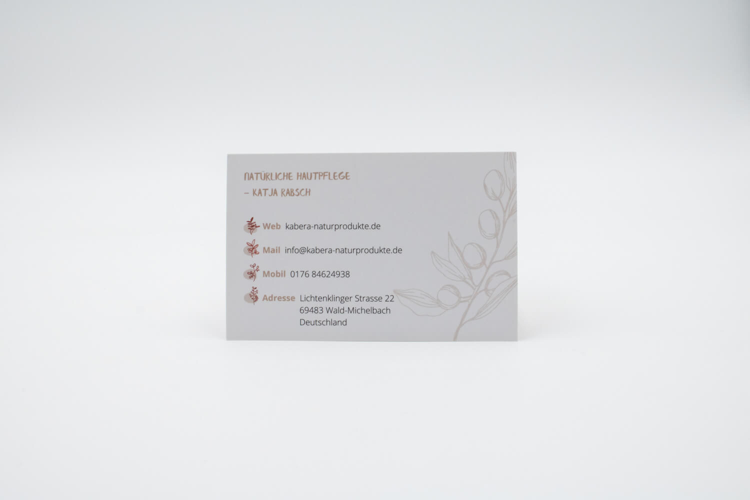 Für Kabera Naturprodukte durften wir ein Flyer im Postkartenformat gestalteten, der beim Versand der handgefertigten Seifen, Lippenpflege oder Shampoos mit in den Karton gelegt wird. Passend dazu haben wir ebenfalls die Visitenkarte für Katja Rabsch gestalten.