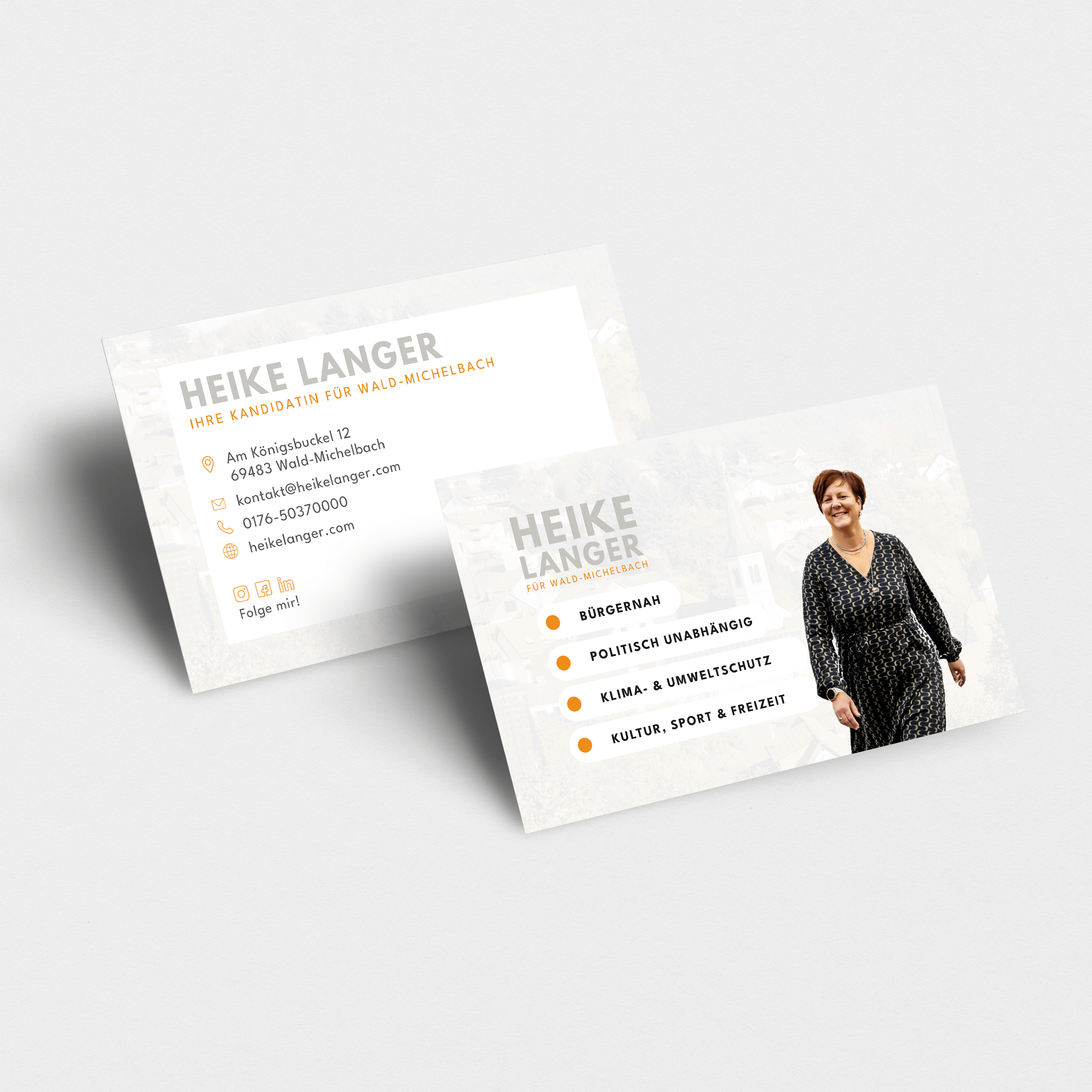 Heike Langer bewirbt sich als Bürgermeisterkandidatin für Wald-Michelbach im Jahr 2023. Zu jeder Wahl gehört natürlich auch die entsprechende Kampagne. Neben ihrer modernen Website haben wir hochwertige Visitenkarten und übersichtliche Flyer entworfen sowie drucken lassen: Denn die Gestaltung einer erfolgreichen Wahlkampagne mit Wahlwerbung ist entscheidend für den Erfolg eines Bürgermeisterkandidaten oder einer Kandidatin.
