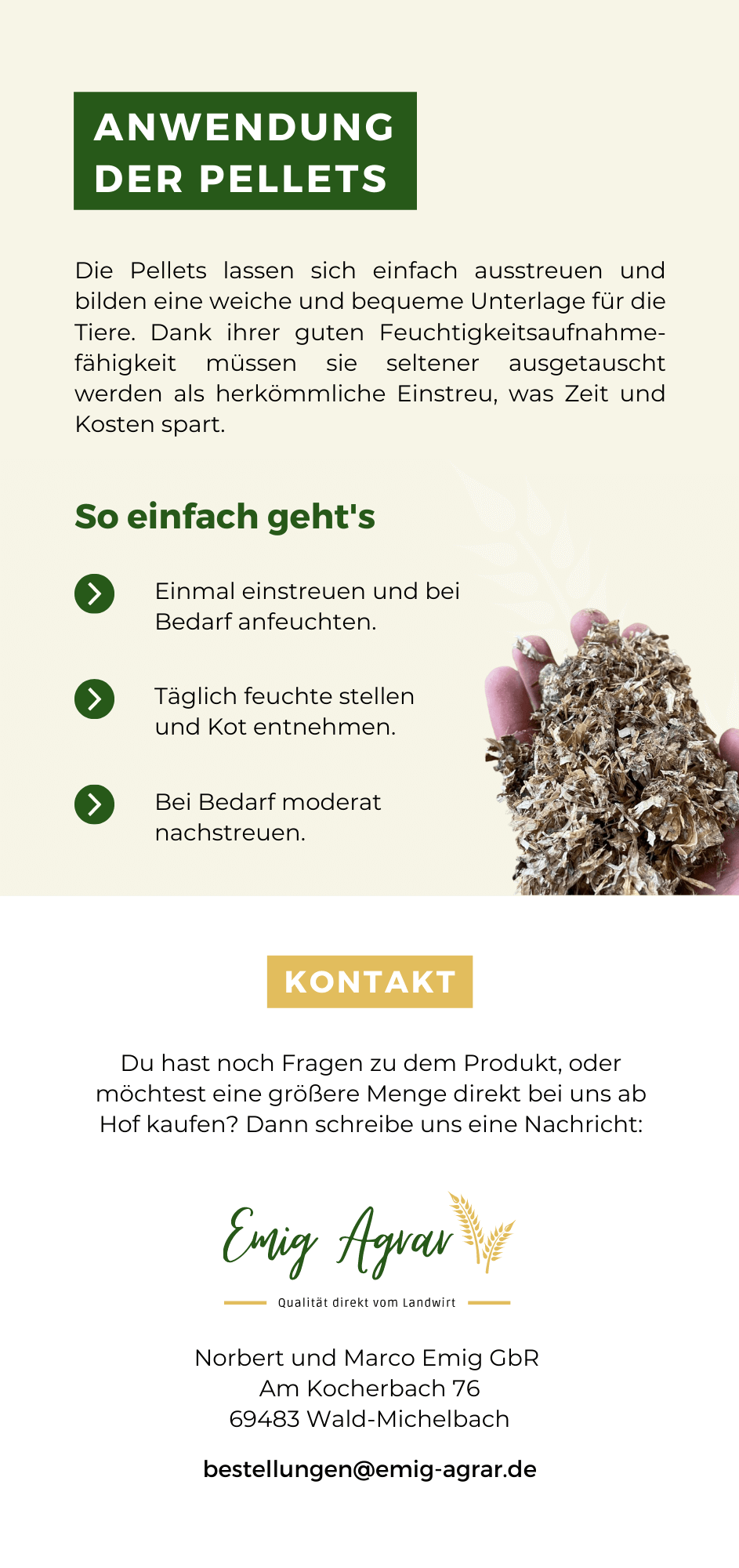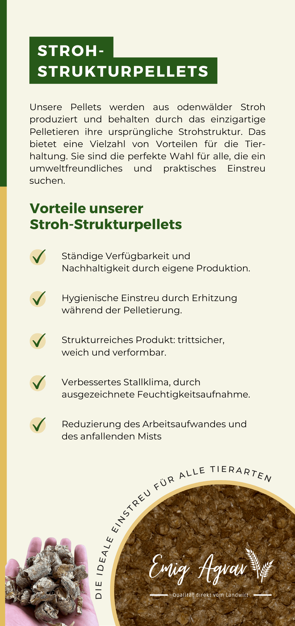 Nun aber zurück zu Emig Agrar’s Stroh-Strukturpellets: Diese Pellets sind einzigartig, da sie aus reinem Stroh hergestellt werden und somit vollständig nachhaltig und umweltfreundlich sind. Zudem haben sie eine besondere Struktur, welche für eine optimale Feuchtigkeitsregulierung sorgt und somit eine gesunde Haltung der Tiere gewährleistet.
