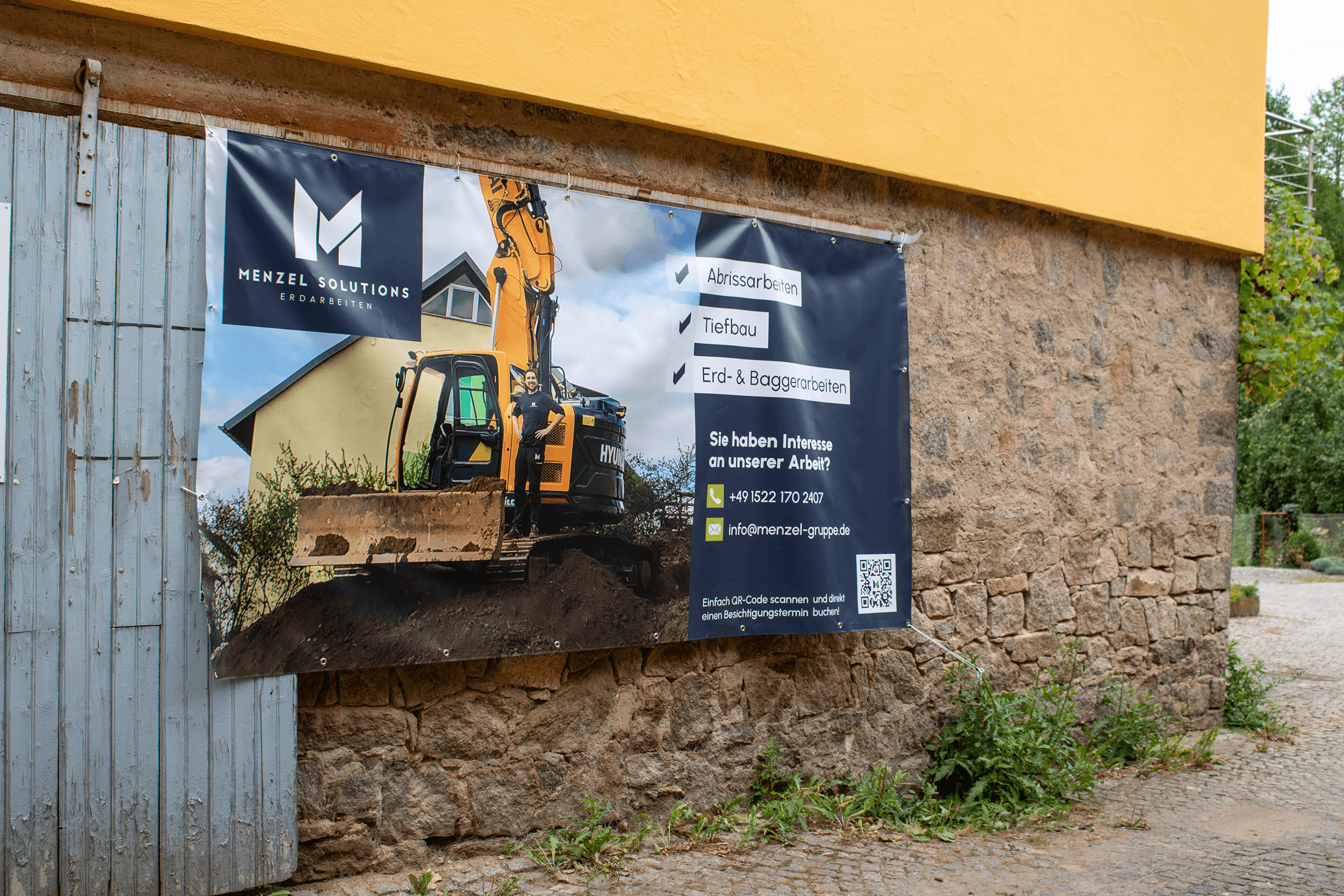 Für die Menzel Gruppe haben wir ein modernes Werbebanner erstellt, der über das Unternehmen informiert und zur Terminvereinbarung führt. Die Bauzaunplane beschafft dem Unternehmen Aufmerksamkeit, ohne dass eine Werbefläche gebucht werden muss. Denn diese hat der Kunde bereits: Seine eigenen Bauzäune!