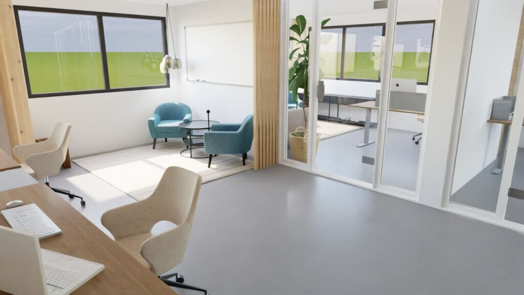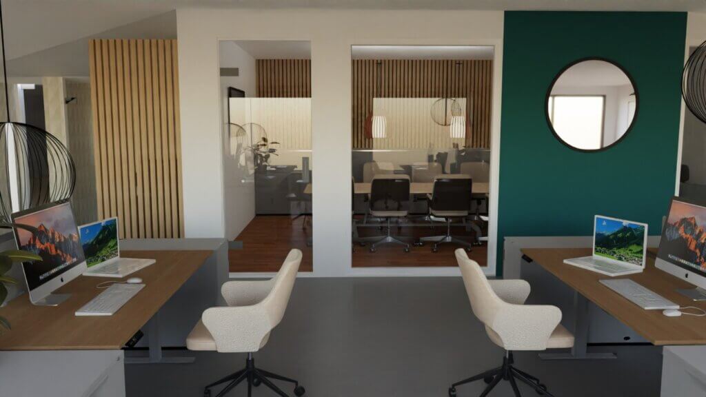 Aktuell befindet sich direkt unter dem Dach noch das Matratzenlager aus Jugendzeiten, hinter einer Sprossenwand lagert unser hochwertiges Kamera-Equipment. Wir sind mit unserer beruflichen Entwicklung und des Unternehmens nun über den Punkt hinaus, an dem sich dieser improvisierte Startup-Look passend anfühlt und manche Faktoren stören eher. Mehr Platz für Kundenparkplätze und Ladestationen sowie die Möglichkeit für Lagerräume und ein funktionales Büro mit kreativen Freiräumen, wie Whiteboards, Stehtischen und professionellem Meetingraum inkl. Beamer sind die Perspektiven, auf die wir uns freuen.